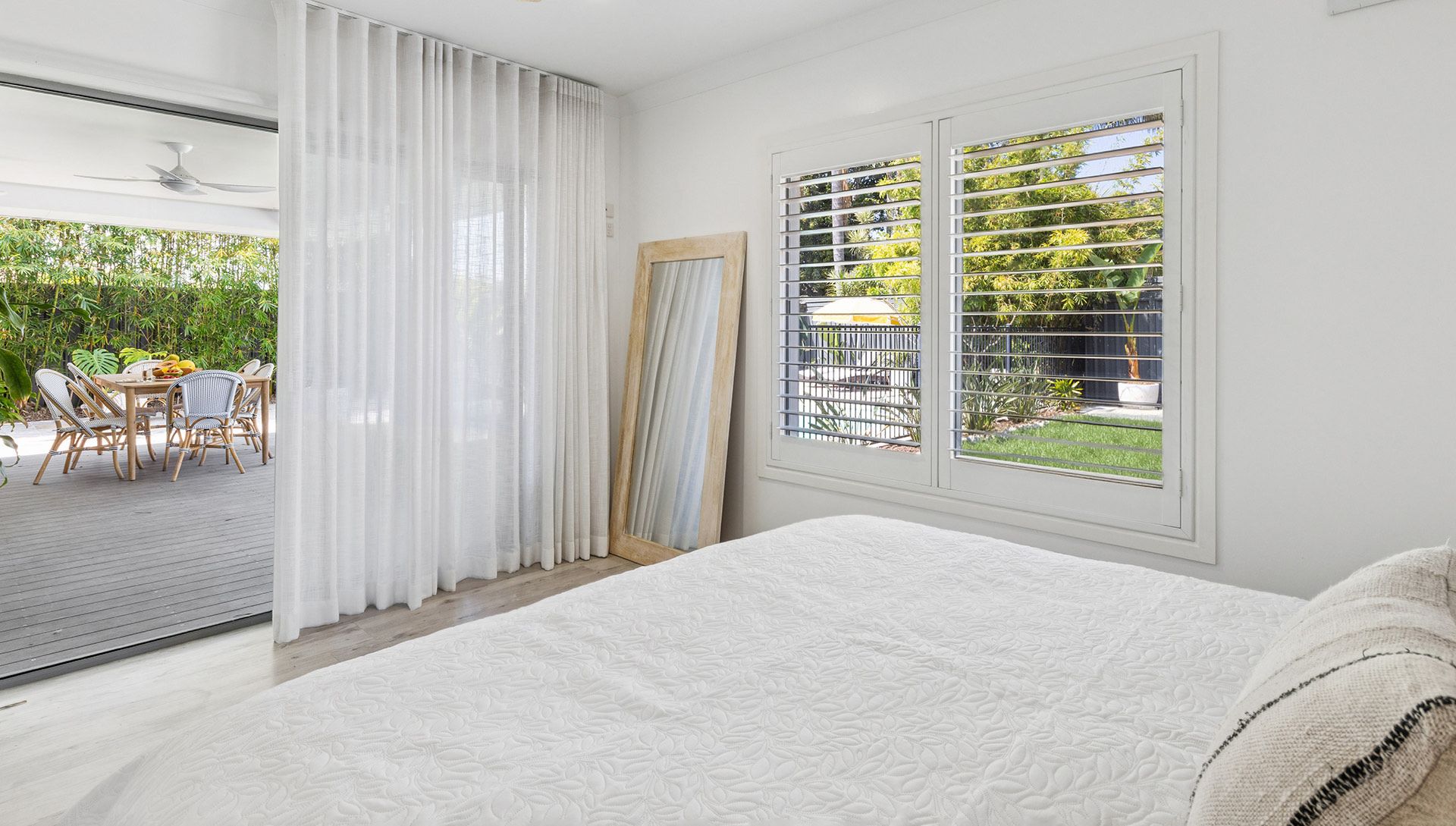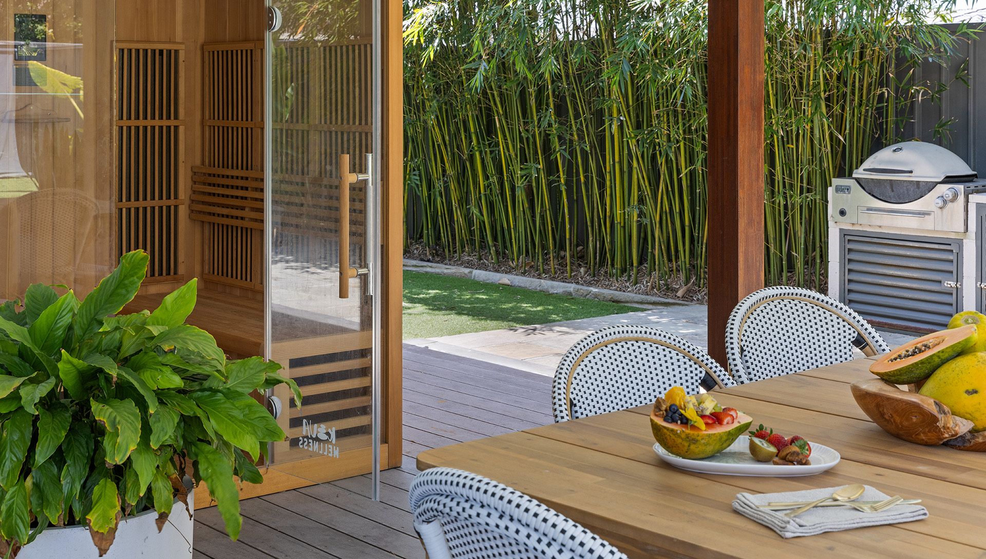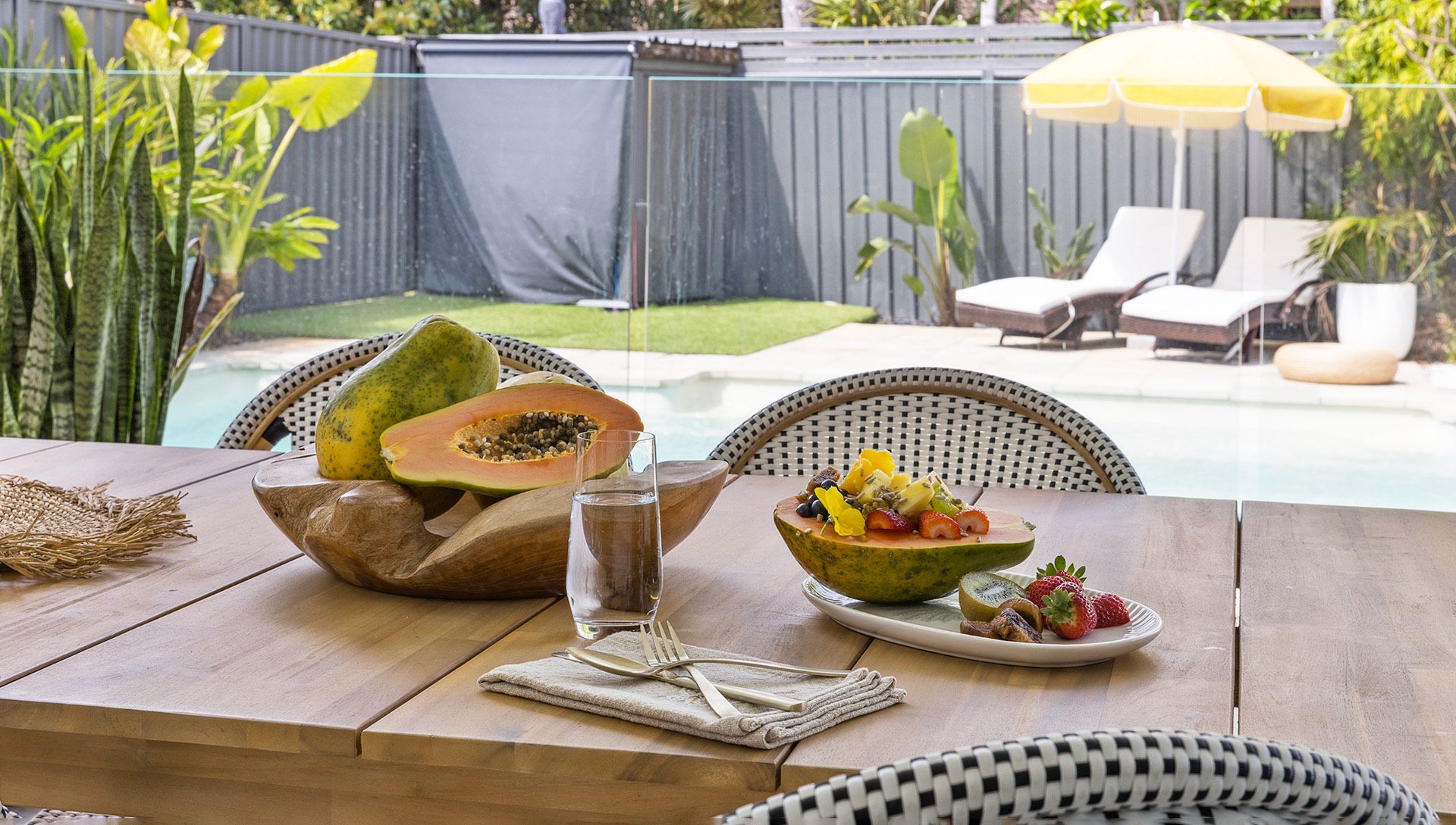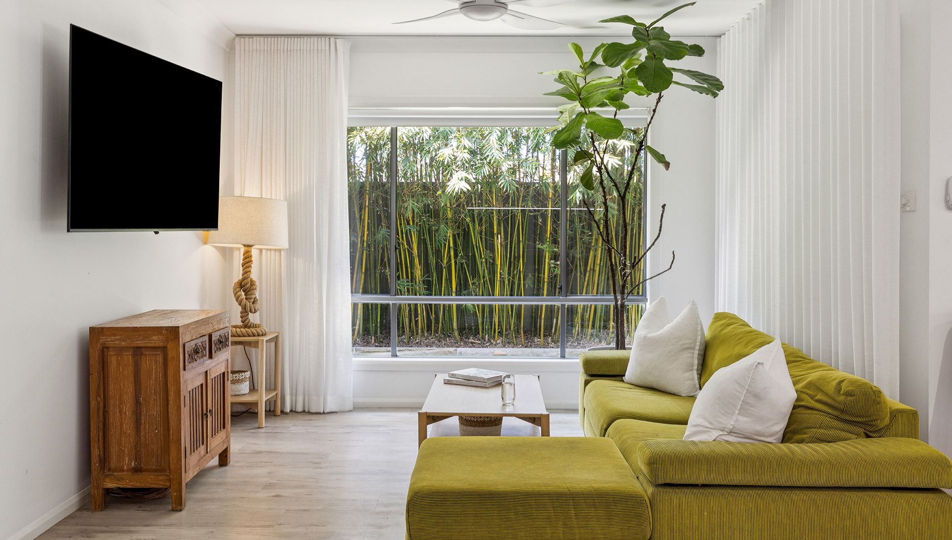 The covered outdoor entertaining area, complete with a television, creates the perfect setting for long afternoons and balmy evenings spent with family and friends. With every detail carefully considered, Behind Bamboo is a holiday home like no other — a place where memories are made, moments are shared and every stay with Holiday Yamba becomes part of a story you’ll want to return to again and again.