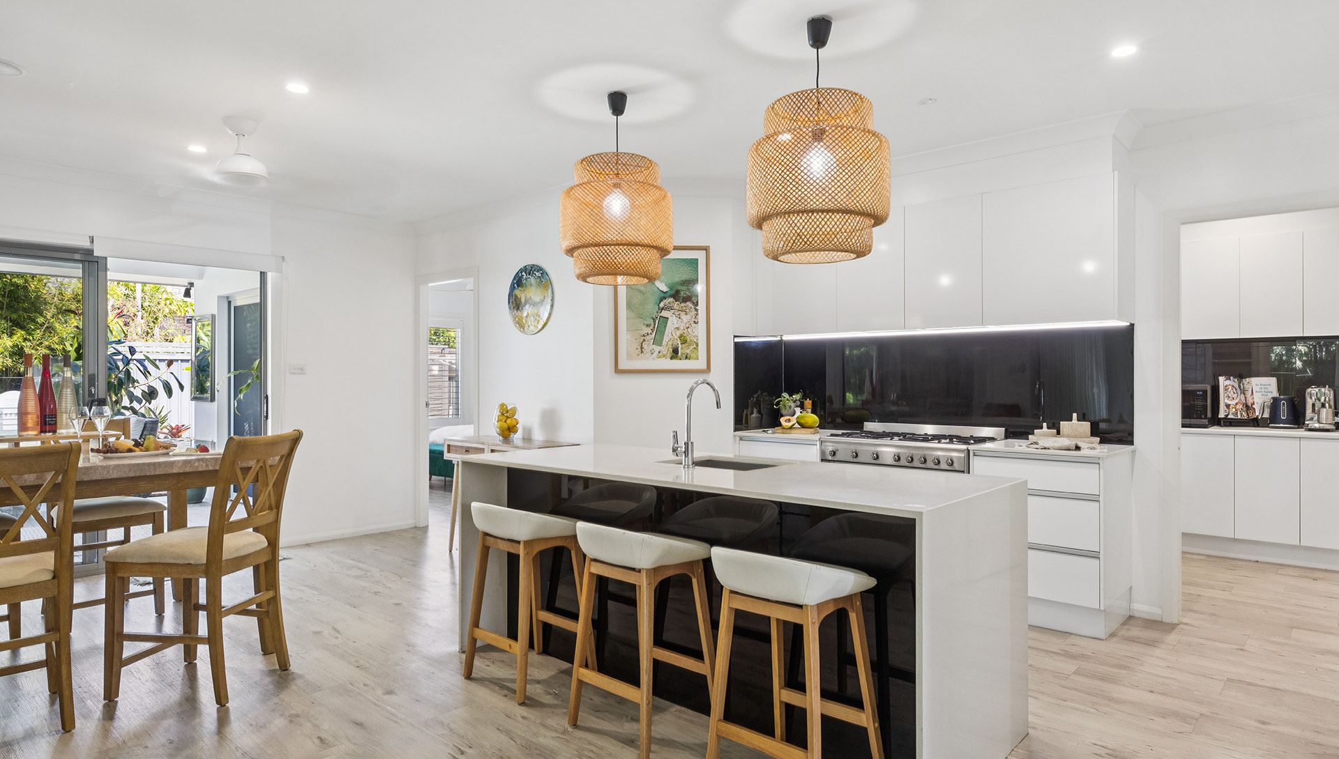 This stunning four-bedroom home is a haven of comfort and thoughtful design, featuring two generous living areas that allow everyone to relax and reconnect. The chef’s kitchen, complete with a butler’s pantry, makes preparing shared meals and entertaining effortless. Tucked away for privacy, the parents’ retreat at Behind Bamboo boasts a luxurious ensuite with a double shower, offering indulgence and seclusion. Holiday Yamba guests will appreciate the clever layout that balances togetherness with private spaces.