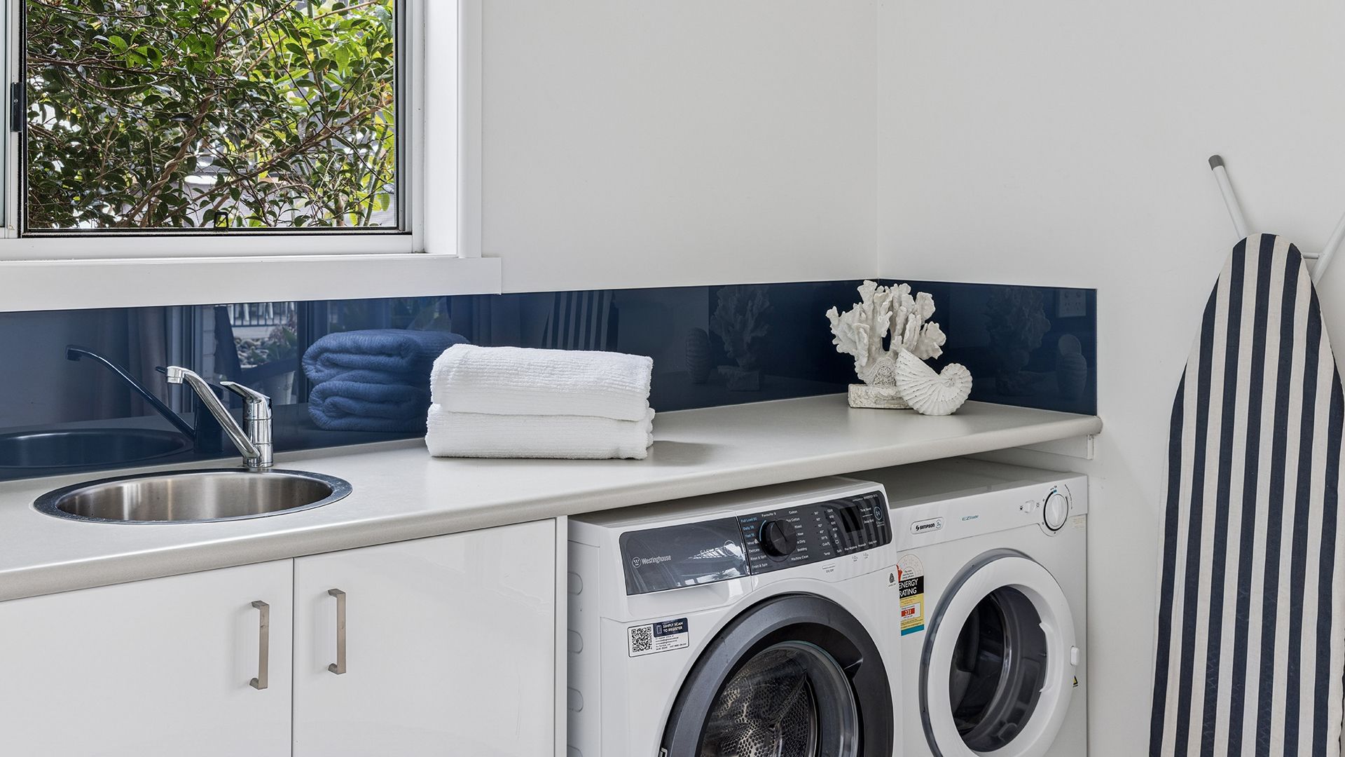 Downstairs, you’ll find a comfortable family room, a spacious bedroom, and a bathroom with shower and toilet, ideal for rinsing off after a day by the pool or on the water. A laundry adds extra convenience for longer stays.